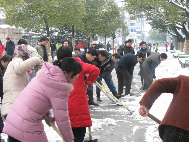 公司全体员工掉臂天寒地冻,热火朝天的在街头挥锹铲雪,迅速清除了公司院内、门前及荣事达大道市府广场至寿春路段交通主干道的路面积雪,包管了公司收支车辆及门前交通干道的行车宁静,受到市民的赞许。
